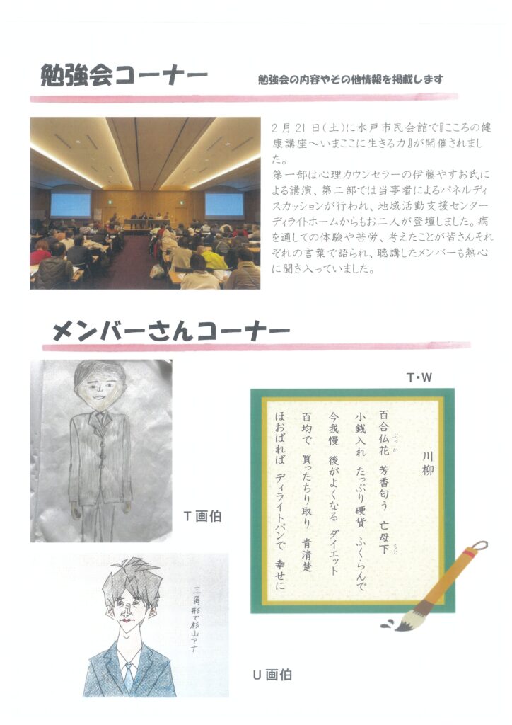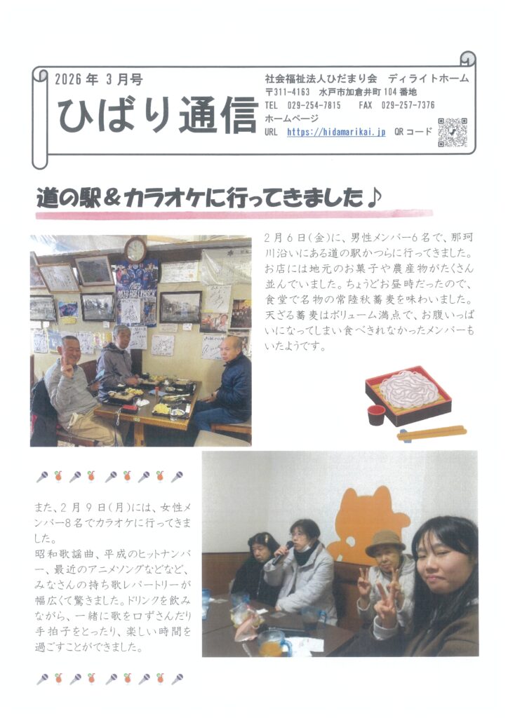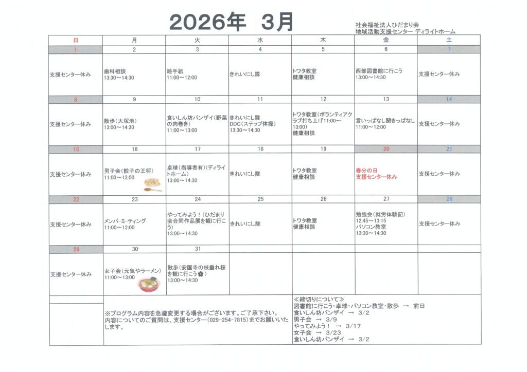 施設からのお知らせ 【ディライトホーム】支援センター3月予定表・ひばり通信 2026.03.02 地域活動支援センターの3月予定表とひばり通信が完成しました。 プログラムによっては、締切りが設けられているものもあります。 ご不明な点などございましたら、支援センターまでご連絡ください 【はっぴぃハウスかさはら】空き室情報